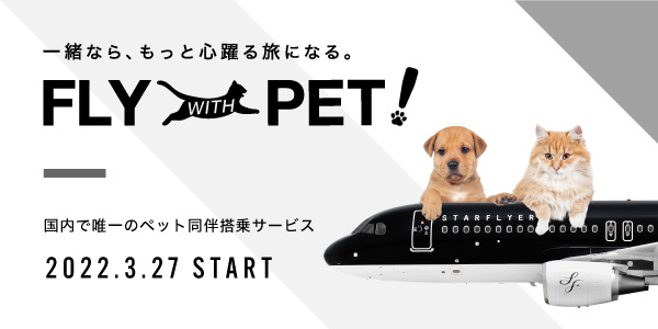 2022年3月27日以降の北九州発東京(羽田)行78便/90便、および東京(羽田)発北九州行77便/89便をご予約・ご購入のお客様へ:当該便は「FLY WITH PET!(ペット同伴サービス)」対象便となります。サービスの詳細はこちらをご確認ください。