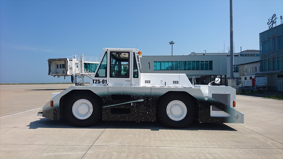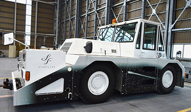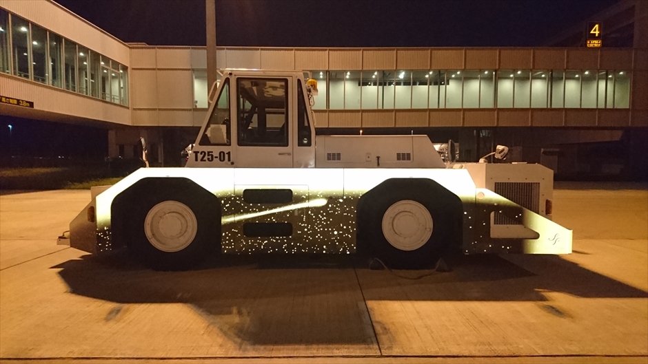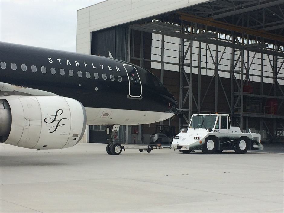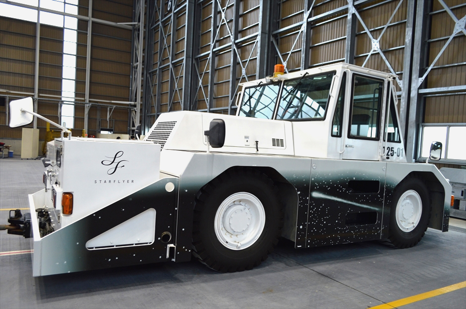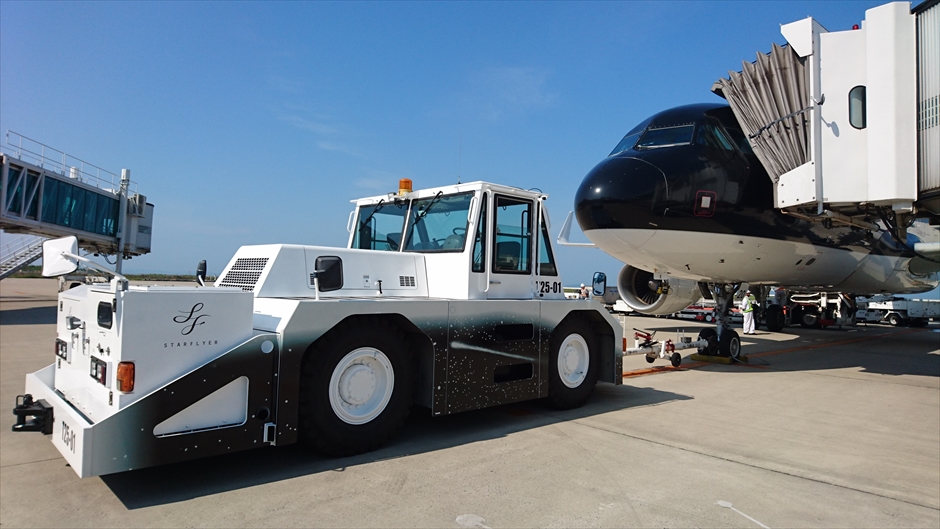 空港内で見かける特殊車両の一つ、トーイングカー(出発時に航空機を押す車)が10周年を機に塗装が新しくなりました!スターフライヤーのコーポレートカラーの白と黒を基調とし、ブランドコンセプトの「mother comet(母なる彗星)」を中心に無数の星を散りばめた、他の空港では例を見ないデザインとなりました。なお、デザインの一部に反射素材を使用しており、夜でも星の輝きが引き立ちます。北九州空港でしか見る事の出来ない貴重な一台です。