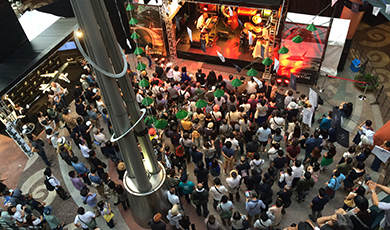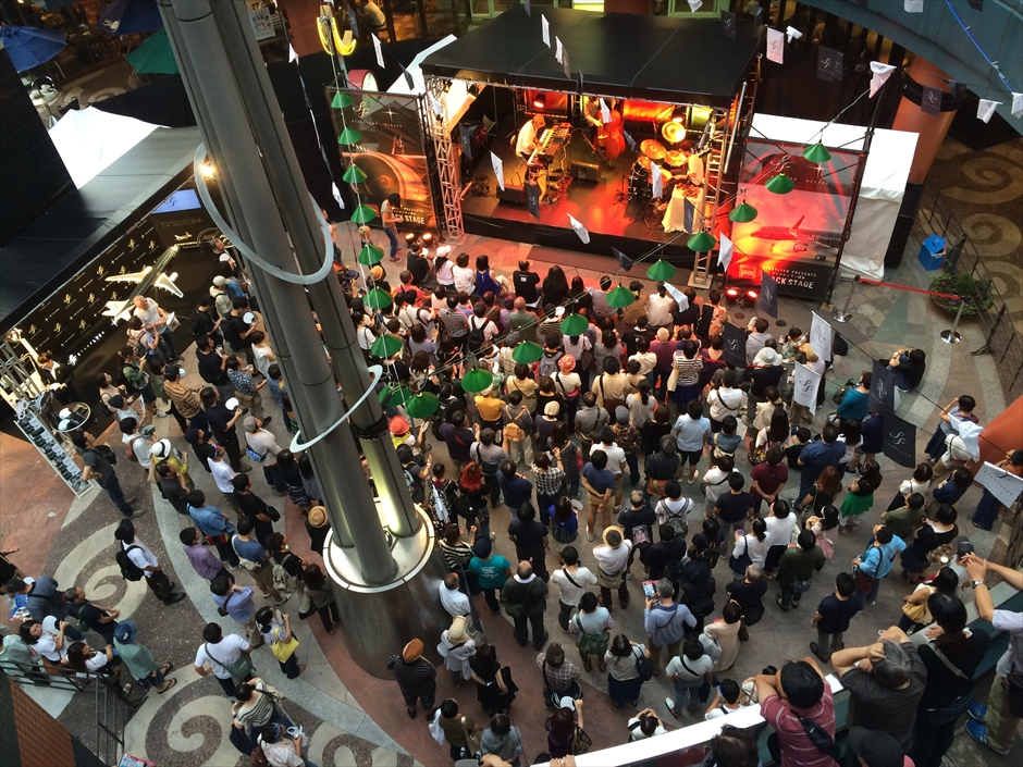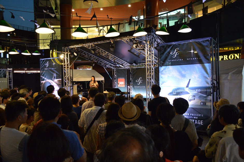 9月9日・10日の2日間、福岡・中洲にて、約90組のアーティストたちが、音楽で街を盛り上げました。キャナルシティ博多では、スターフライヤーが提供した「BLACK STAGE」が登場。計6組のアーティストが、それぞれ個性溢れるパフォーマンスを披露し会場を湧かせました。スターフライヤーのPRコーナーでは、司会と客室乗務員の掛け合いによるPRを実施。訪れたお客には記念撮影をお楽しみいただきました。