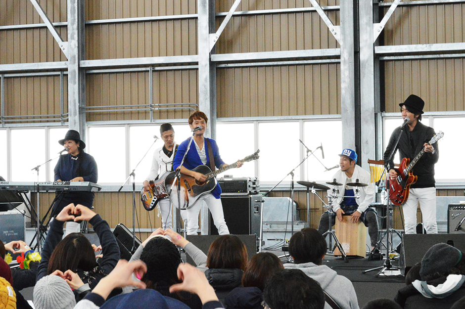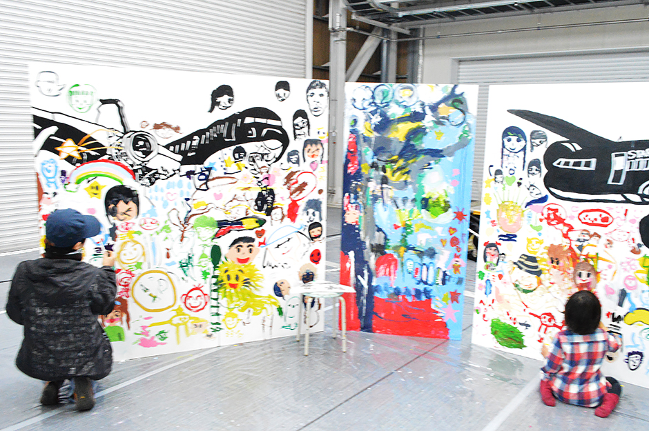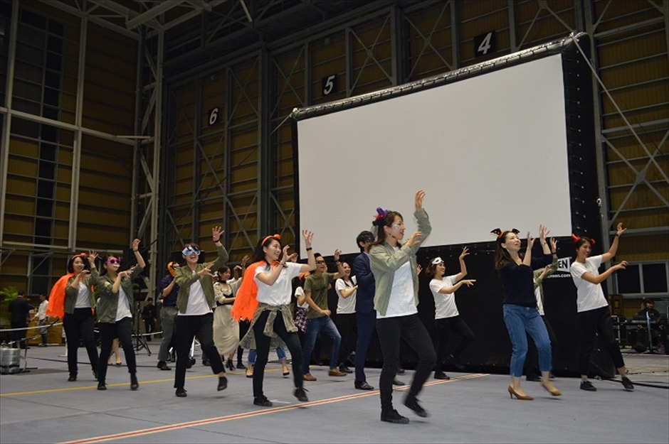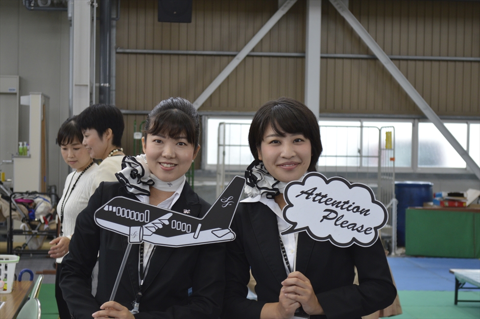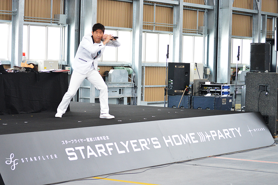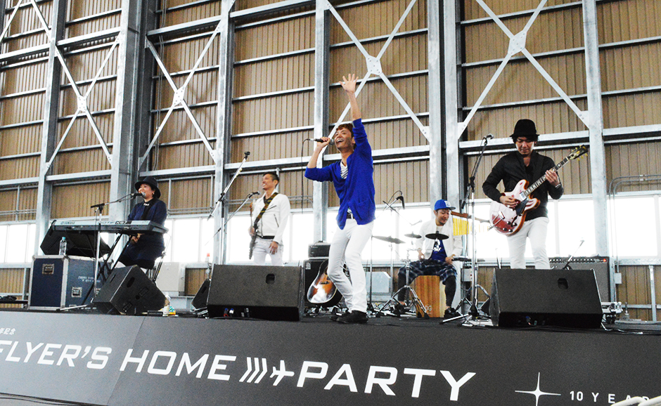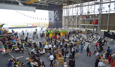 格納庫を一般開放して、10周年感謝祭を行いました。HOME PARTYと題したこのイベントでは、グッズ販売や制服撮影会を始め、ママさん社員達の発案によるクイズラリーを実施。また、HYのアコースティックライブや、原口あきまささん、ビッグスモールンのお笑いライブ、ラグビーレッドスパークスのパフォーマンス、スタイリッシュなフードコーナーなど、おうちでくつろぐような雰囲気でお楽しみいただけたと思います。