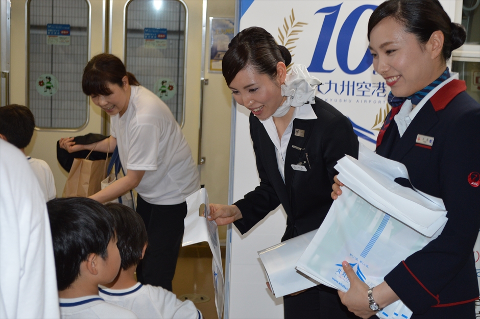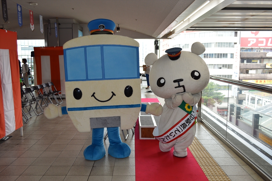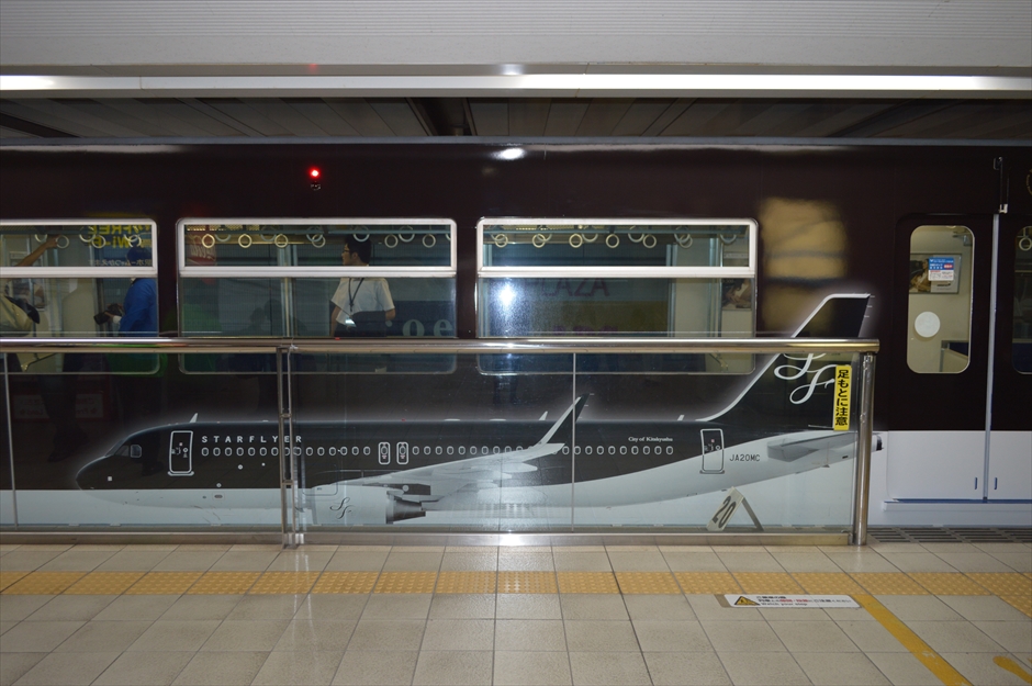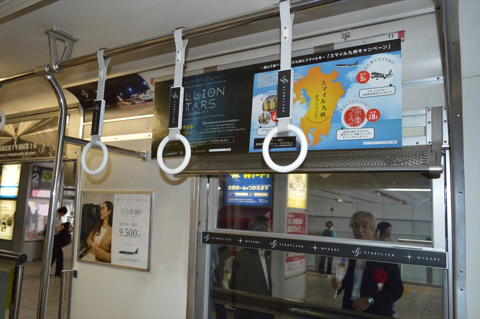 北九州空港の開港10周年を記念し、北九州空港と就航エアラインのラッピング広告が施されたモノレール「北九州空港開港10周年記念号」の出発式が小倉駅にて行われました。当日は『ていたん』が一日駅長を務め、モーノくんと一緒に三萩野保育園の園児たちのお見送りをしました。期間限定で、モノレール車内もスターフライヤー一色に!(〜7月24日まで)※ラッピングモノレールは、2017年3月31日まで運行