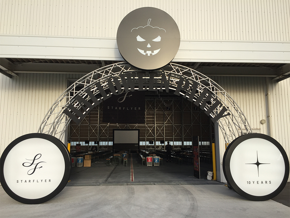 SFJメンテナンスセンター(格納庫)にて2日間にわたり、就航10周年記念のハロウィンパーティーを開催しました。両日合わせて約800名のお客様にお越しいただき、仮装をして写真撮影ができるフォトスペースやハロウィンのプチメイク体験、仮装グッズやランタン作り、その他、WITH THE STYLE Fukuokaが提供するお食事やPOP UP THEATERによる映画上映などをお楽しみいただきました。