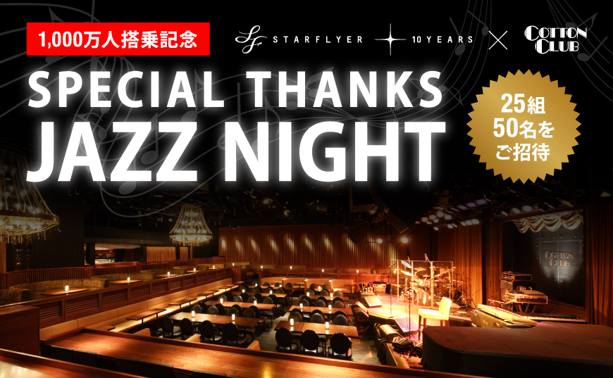 多くのお客様にお選びいただいたことを記念し、お客様へ感謝の気持ちをお伝えする為、「1,000万人搭乗記念 STARFLYER × COTTON CLUB SPECIAL THANKS JAZZ NIGHT」を開催いたし、そのプレミアムな一夜に25組計50名のお客さまを抽選でご招待します。