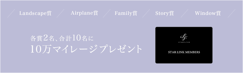 10万マイレージ賞ご当選の方は、当社のマイレージプログラム(STAR LINK会員)へ入会している(または当選後に入会する)ことが賞品授受の条件になります。STAR LINK会員規約。