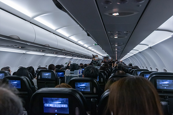 また、機内照明を消灯している間は席をお立ちになれない為、35分ほどは着席したままの時間がございます。