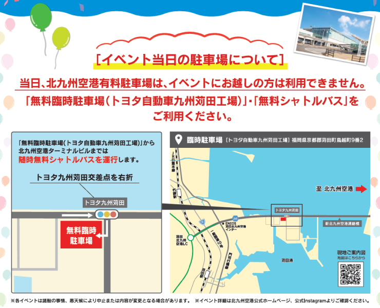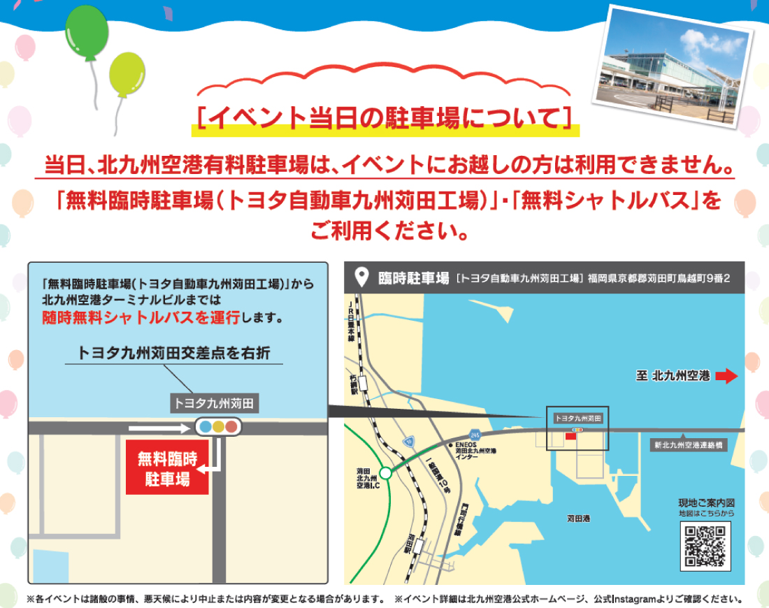 - 格納庫にお客様用駐車場はございません。当日、北九州空港有料駐車場は、イベントにお越しの方は利用できません。お車でお越しのお客様は、無料臨時駐車場(トヨタ自動車九州苅田工場)・無料シャトルバスをご利用ください。無料臨時駐車場の場所はこちら