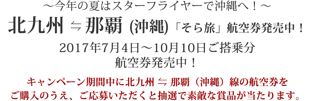 | 対象のお客様 | スターリンク会員の方で応募期間中、スターフライヤー夏季限定就航【北九州⇄那覇(沖縄)】便の航空券をご予約・ご購入をいただいたいた方 (出発日に制限はありません) |