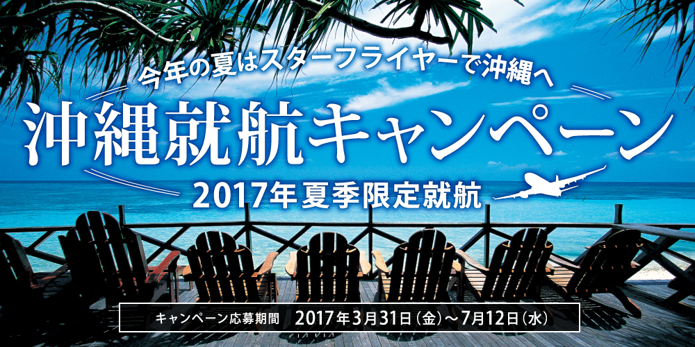 | キャンペーン内容 | 応募期間中、スターフライヤー夏季限定就航【北九州⇄那覇(沖縄)】便の航空券をご予約・ご購入いただき、かつキャンペーンにご応募いただいたスターリンク会員の中から抽選で素敵な賞品をプレゼントいたします。 |