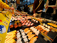 ふくといえば、「唐戸市場」。魚好きでなくても、一度は足を運びたくなる下関屈指の活気ある市場に、ひとたび足を踏み入れれば、獲れたての魚介類に舌鼓を打つこと間違いなし!