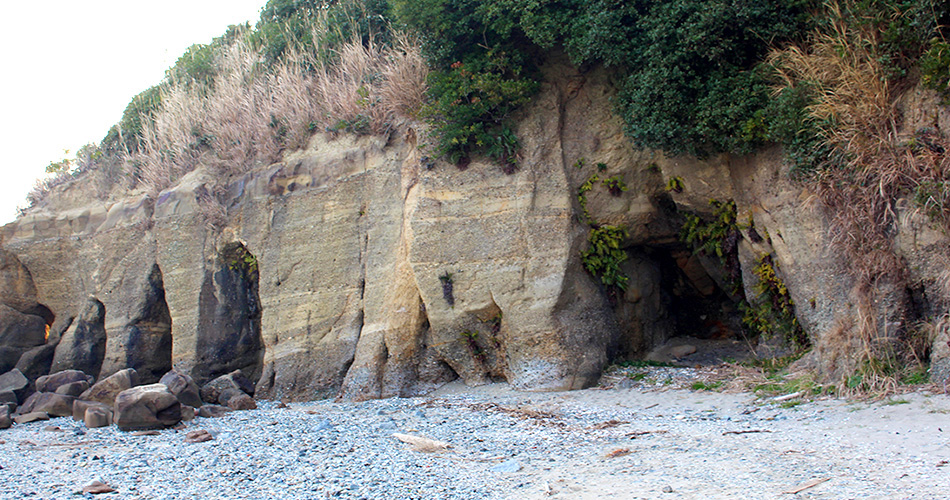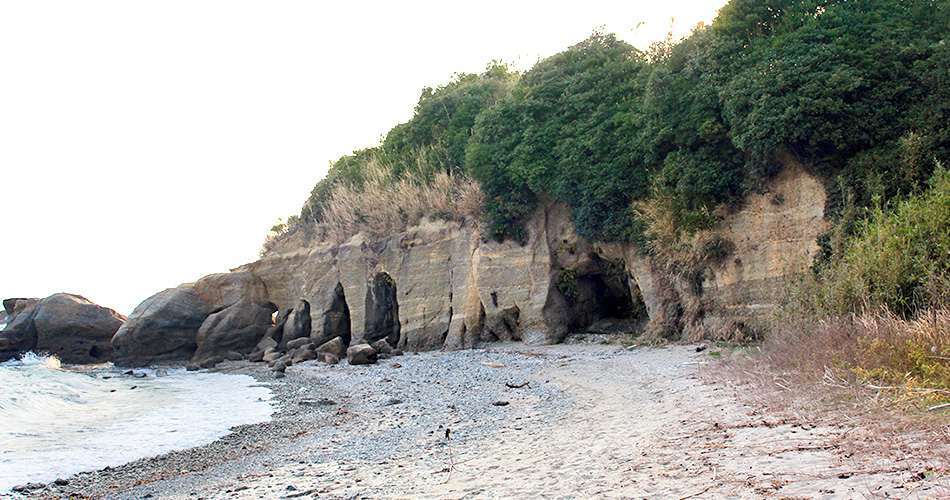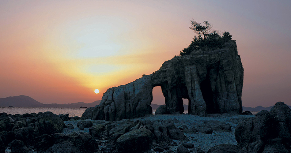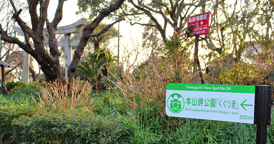 本山半島最南端の本山岬にある奇岩、通称「くぐり岩」は、海食が進んだ結果、海食洞が貫通してトンネル状になったもので、山陽小野田市では有名な観光スポットになっています。トンネルは大小あわせて3本あり、最大のもので、高さ約3mもあります。「くぐり岩」へは、本山岬公園の駐車場から坂道を下って海岸に出ますが、干満の差が大きく、満潮時は海に沈んでしまうので、引き潮時でないと行けません。
