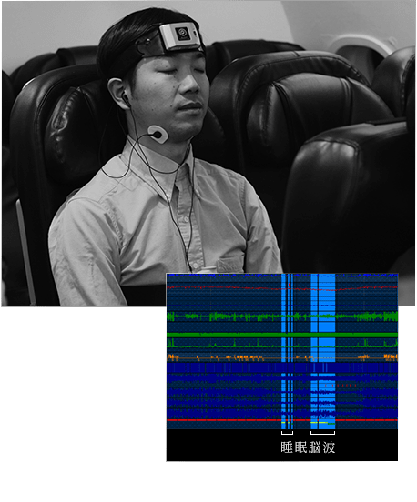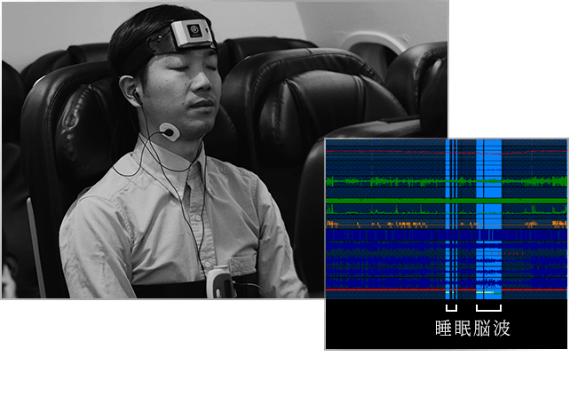 「Star Chorus」は、周波数マスキング効果で機内の飛行音が気になりにくい設計になっているため、より音楽に集中できます。実際に何も聴かずに飛行機で移動した場合と、「Star Chorus」を聴いて飛行機で移動した場合の脳波や眼球運動などを計測して比較した結果、62.5%の人が「Star Chorus」を聴いて移動した方が、睡眠脳波が多く出現しました(※)。この試験結果からも「Star Chorus」の入眠効果、副交感神経を優位にするリラックス効果が実証されたと考えられます。