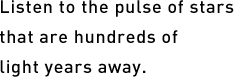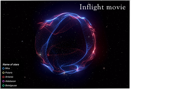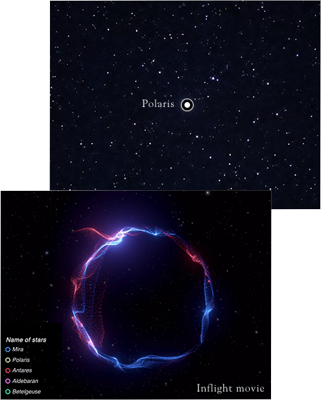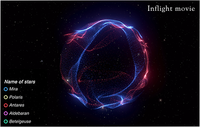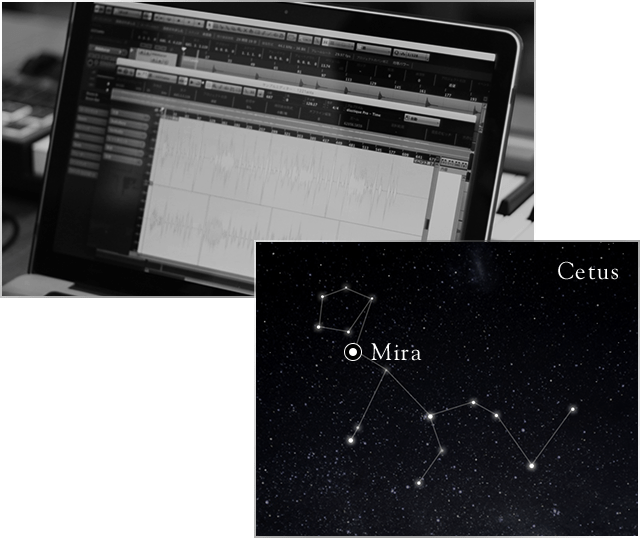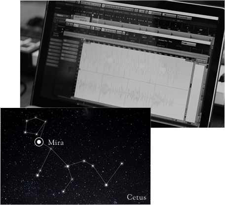 Pulsating variable stars change brightness as if throbbing and pulsating. The cycle (rhythm) of each is greatly distinct. We converted the pulsating rhythm of these five stars into musical intervals and tempos and represented them with instruments and acoustics with varying timbre. Antares is rendered with a string instrument, Aldebaran with a low-pitched bass, Polaris with a piano, Betelgeuse with sound effects, and Mira, which has the largest fluctuations, with electronic sounds.