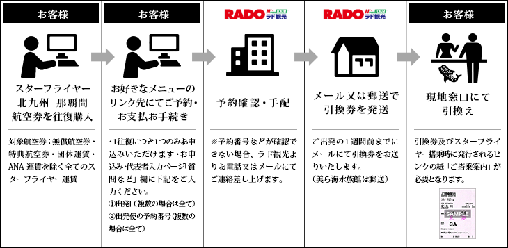 ※お申込み後、ラド観光(株)が①-②の情報を基にお客様のご予約状況を確認させていただきます。 - スターフライヤー公式ダイナミックパッケージ、旅行代理店販売のパッケージツアーをご利用のお客様は、その旨ラド観光(株)へお申し出ください。