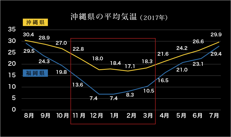 沖縄では年間の気温差が大きくなく1年を通じてあたたかく過ごしやすい気候です。