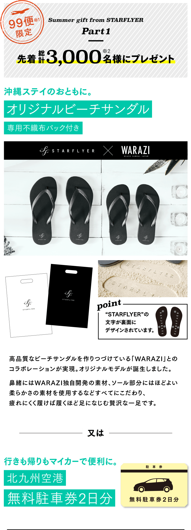 | キャンペーン内容 | キャンペーン期間中、北九州⇄那覇(沖縄)線の航空券をご予約・ご購入をいただき、かつキャンペーンにご応募いただいたお客様の中から先着又は抽選で素敵な賞品をプレゼントいたします。 |