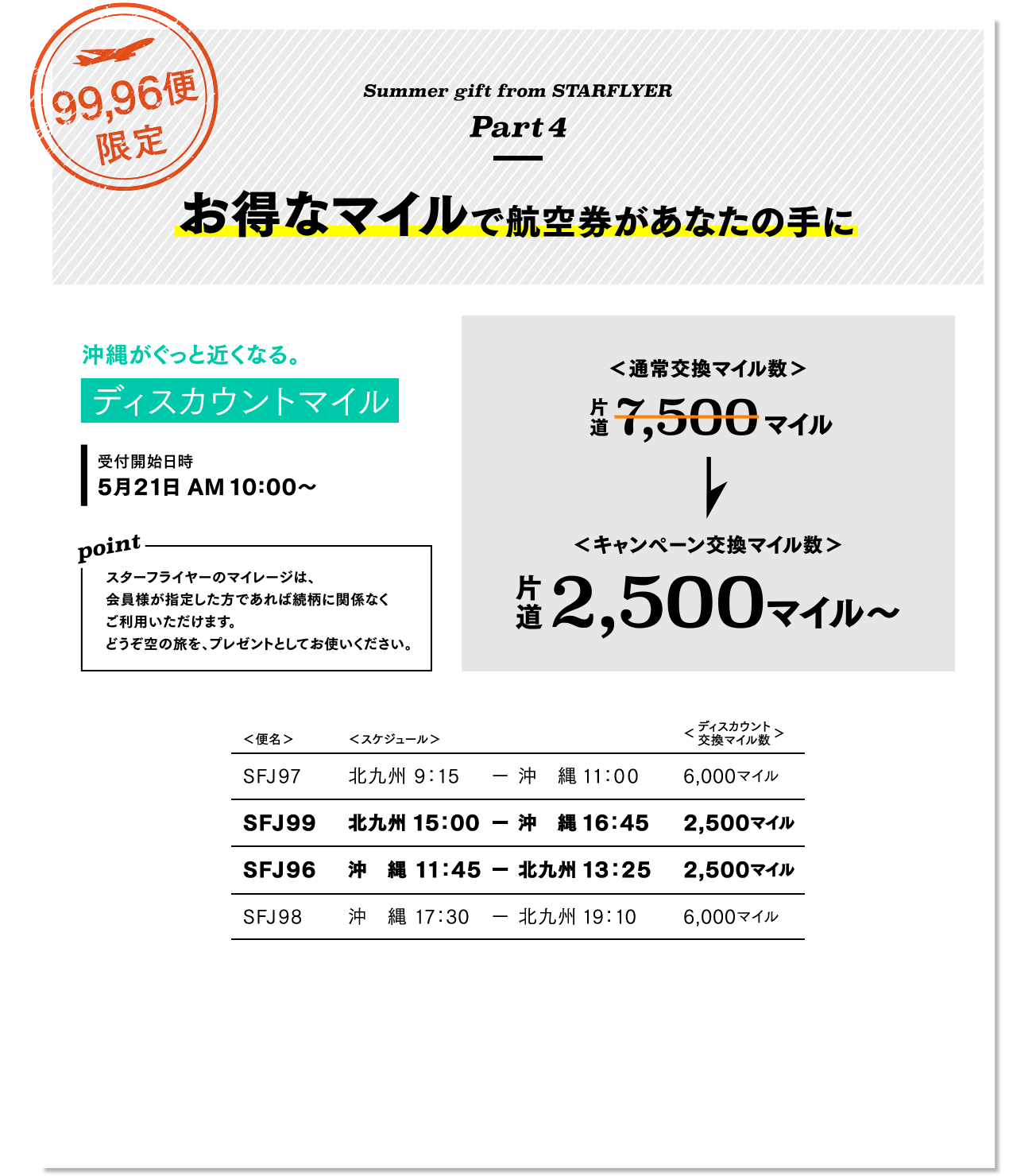 | 対象運賃 | 無償航空券、特典航空券、包括旅行割引運賃、ANA運賃を除く全てのスターフライヤー運賃。