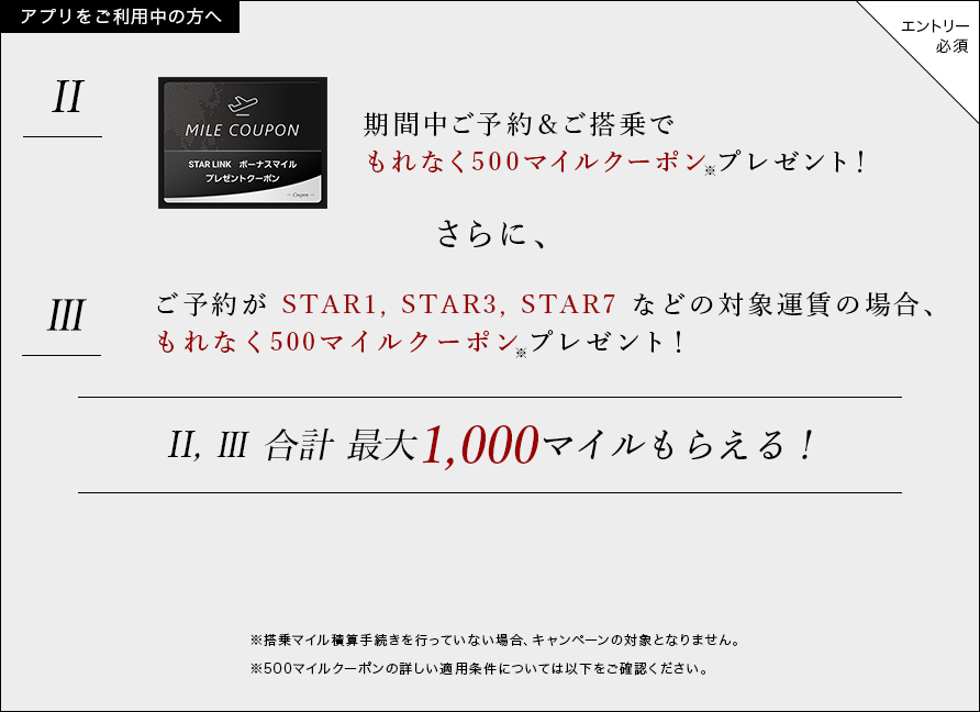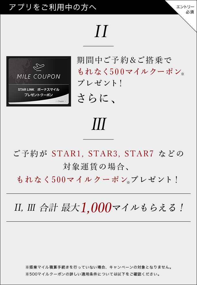 - ・複数回ご搭乗されても、500マイルクーポンは期間中Ⅱ、Ⅲともに1会員につき1回までの配信となります。(Ⅱ、Ⅲの合算でお一人様最大1,000マイル)