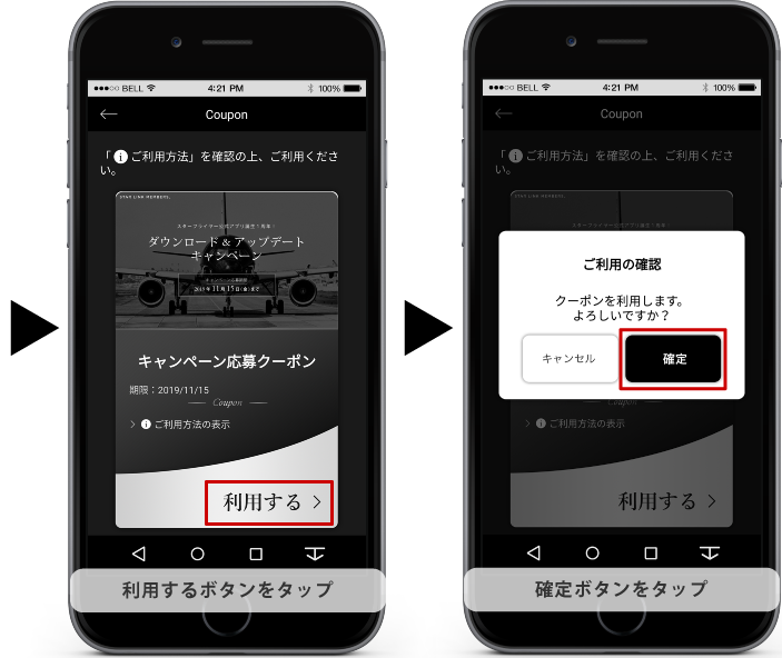 「利用する」ボタンをタップ※クーポン配信まで、ダウンロード後15分程度かかります。