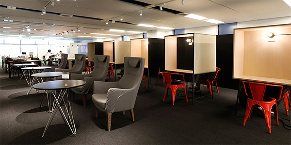 パーテーションで区切られたデスクや、ゆったり座れるワークチェアなど、共有スペースでありながらも、使い方は自由自在です。