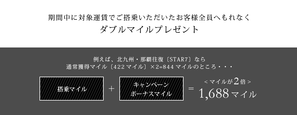 2.北九州ー那覇(沖縄)線を往復でご搭乗のお客様にダブルマイルをプレゼントいたします