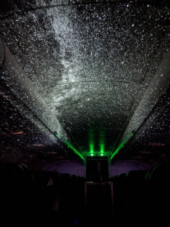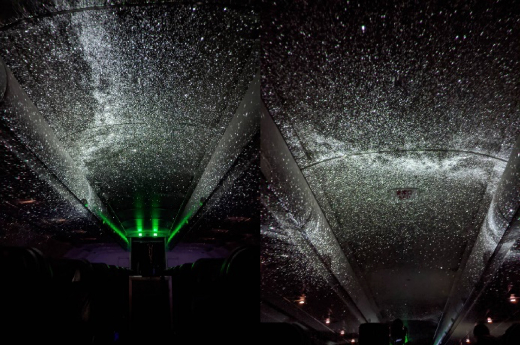 機内通路に合計6 台の上映機材を並べ、満天の星空を機内で再現致します。