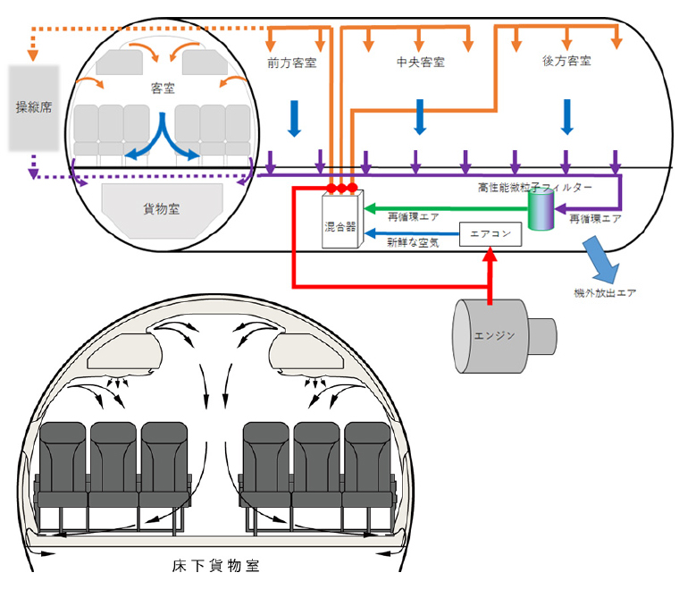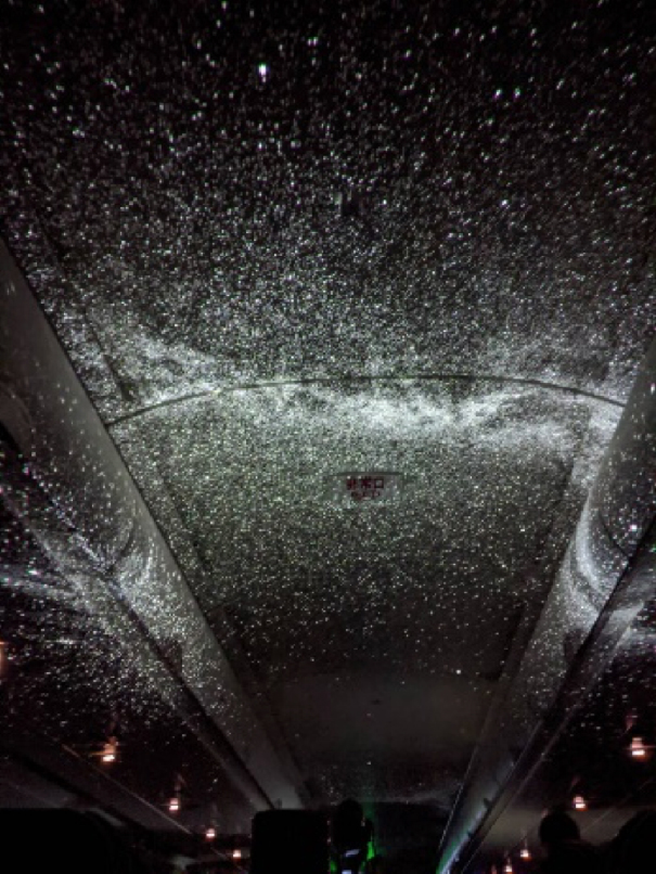 上空約10kmの澄んだ空気の中、通常運航時に比べプラネタリウム上映時は機内を暗くしているため、