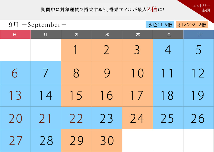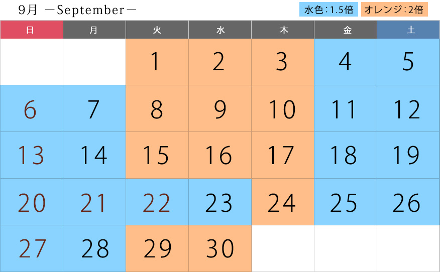 2倍:9月1日/2日/3日/8日/9日/10日/15日/16日/17日/24日/29日/30日 1.5倍:キャンペーン期間中の上記以外の日 |