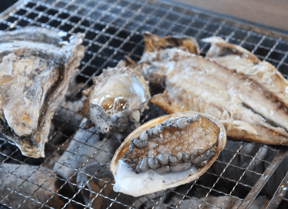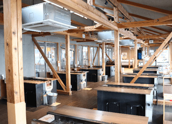 広々とした館内には、購入した魚介を自分で焼いていただくことができる「グリルハウス」も設けられていて、潮風を感じられる開放的な造り。気軽にバーベキューをすることができ、焼き立てを堪能することも可能です。