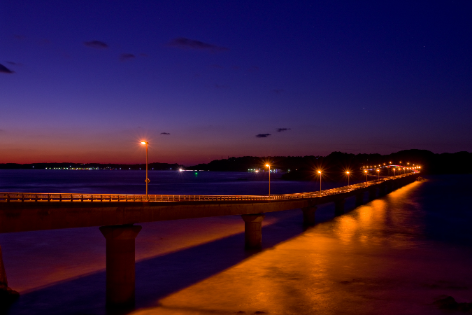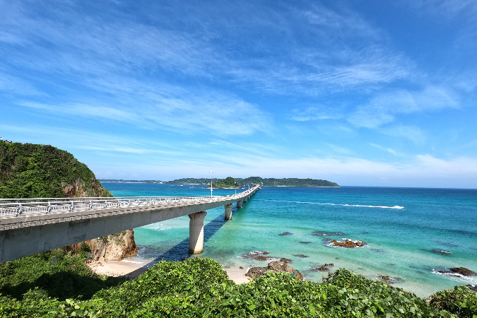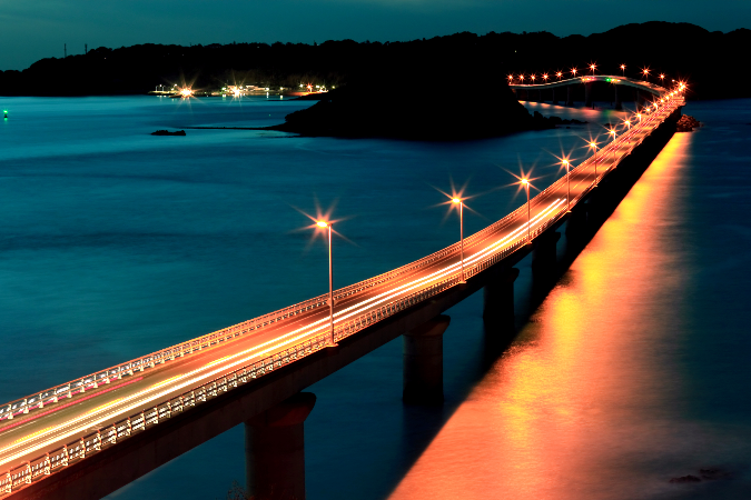 日本海に浮かぶ角島と本州を結ぶ全長1,780メートルの角島大橋。通行料無料の橋としては全国屈指の長さということもあり、ドライブスポットとしても人気に。晴れた日には、コバルトブルーの透き通った海に橋がまっすぐ延びていく絶景が広がります。車で通行すると約3分、角島周辺にも食事処やカフェが多くあるので休憩で訪れるのもおすすめ。