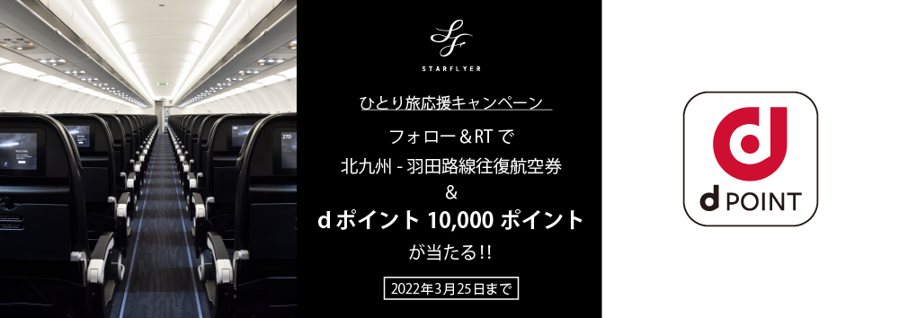 | 企画内容 | スターフライヤー公式アカウントフォロー&対象ツイートをリツイートしてくださった方の中から抽選で5名様にdポイントと航空券をプレゼント |