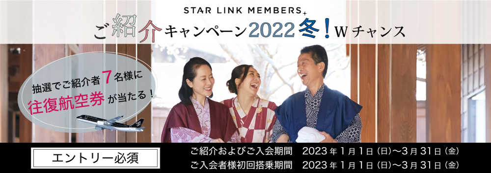 STAR LINK 会員(ご紹介者様)がご家族・ご友人(ご入会者様)を紹介し、ご入会者様が新規会員登録後、初回搭乗期間中にマイル積算運賃にて搭乗すると、抽選でご紹介者7名様に路線が選べる国内線往復航空券をプレゼントします。