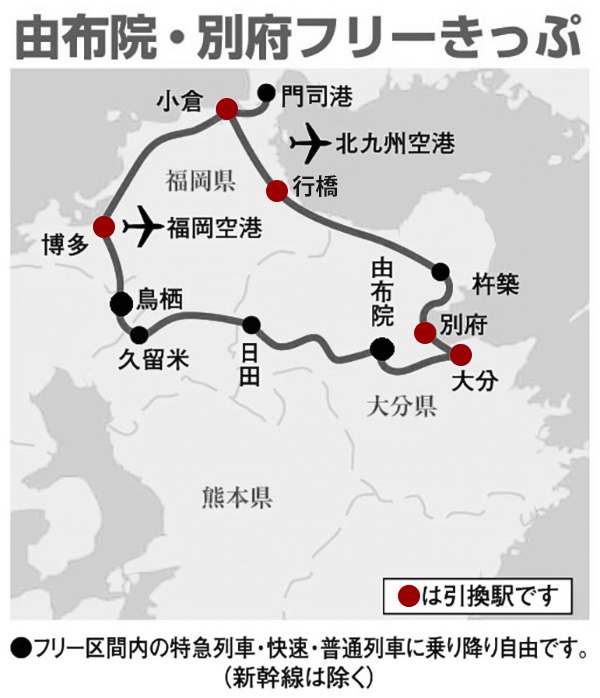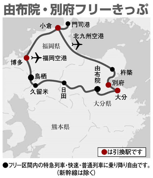 | 由布院・別府フリーきっぷ | 指定席 | 2日間 | 10,000円(税込) | 5,000円(税込) |