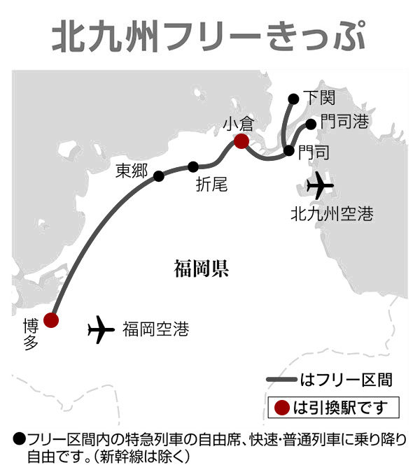 | 北九州フリーきっぷ | 自由席 | 2日間 | 3,500円(税込) | 2,000円(税込) |