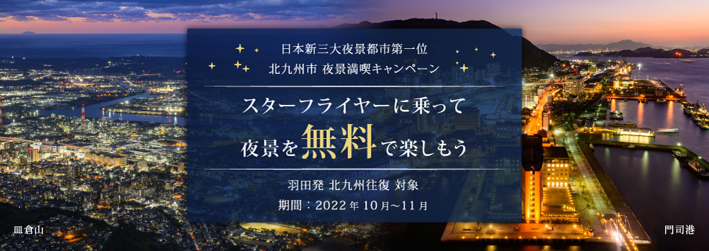 羽田→北九州→羽田にご搭乗または、ご予約をお持ちの方対象。都市と工場夜景が入り混じる北九州らしい景色が望める「皿倉山」と港町の美しい夜景が楽しめるスポット「門司港レトロ展望台」が無料で利用できるキャンペーン開催中です。