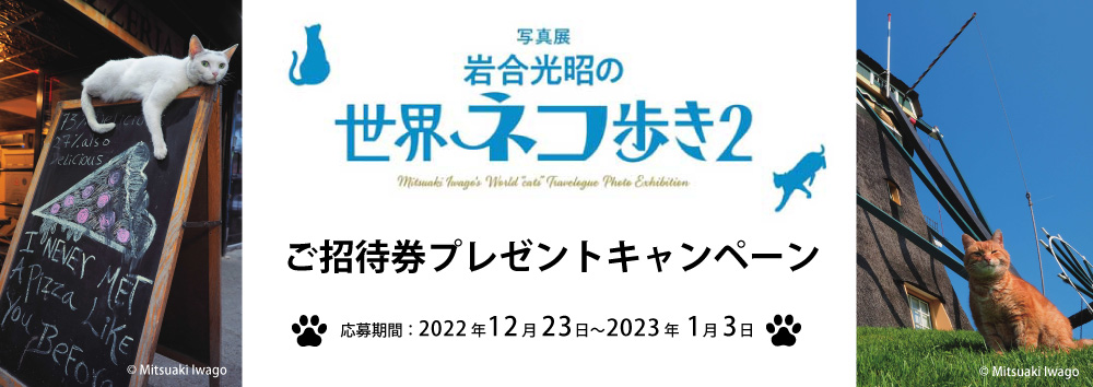 | 概要 | キャンペーンにご応募いただいた方の中から抽選で10組20名様へ「写真展 岩合光昭の世界ネコ歩き2」のご招待券をプレゼントします。 |