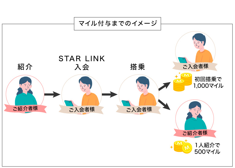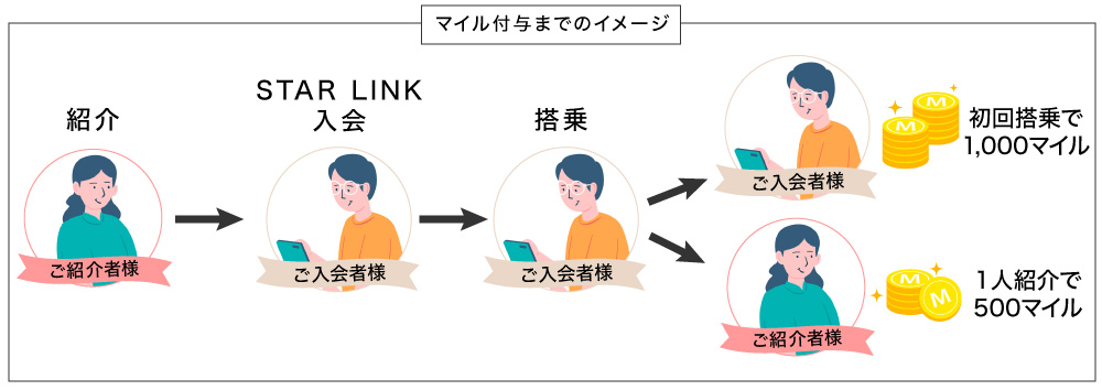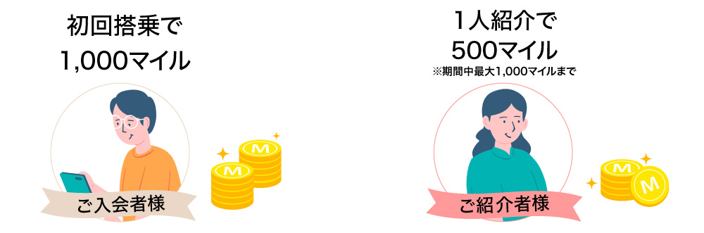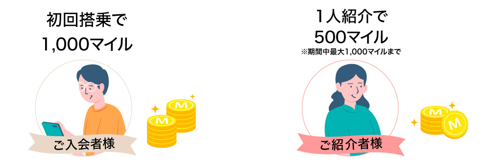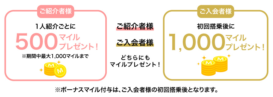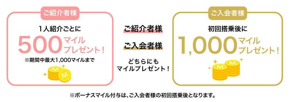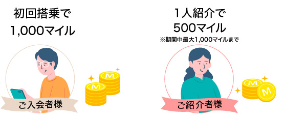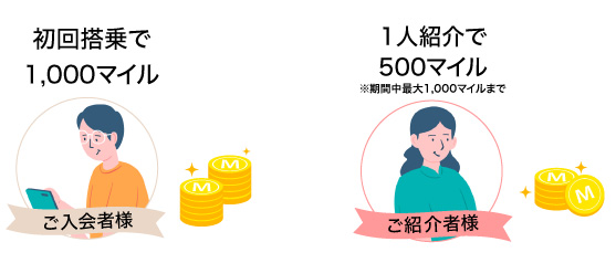 ご入会者様が新規会員登録後、期間中にマイル積算運賃にて初回搭乗を行うと1人ご紹介につき500マイルプレゼント