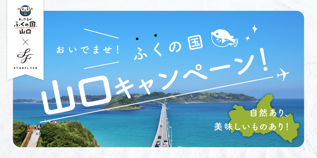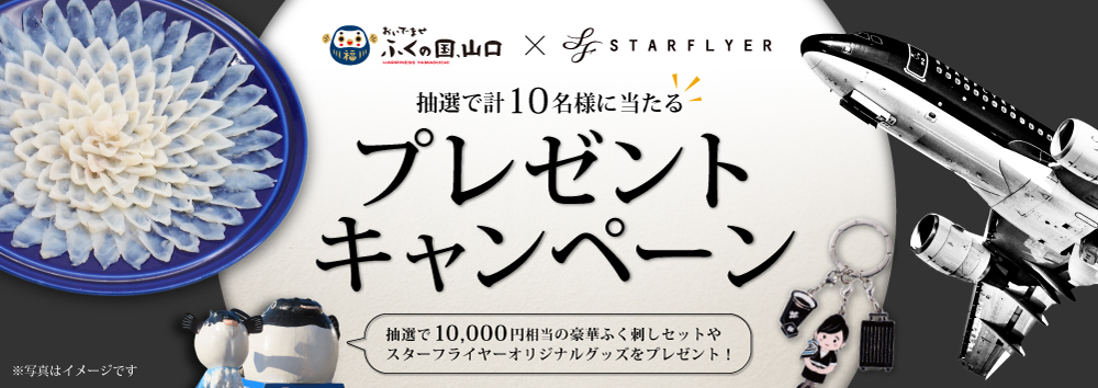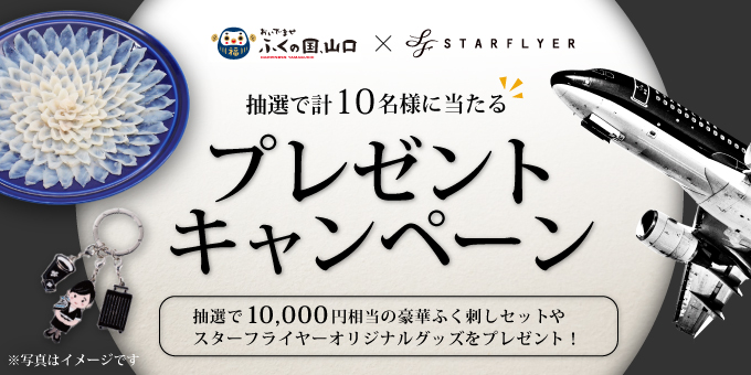 | キャンペーン内容 | ご応募いただいた方の中から抽選で計10名様に山口を代表する味覚「ふく」やスターフライヤーオリジナルグッズをプレゼントいたします。 【賞品内容】
