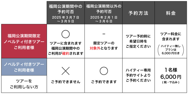 福岡公演期間は、「福岡公演期間限定ツアー」にご参加のお客様で貸切営業となりますので、ご予約いただけません。