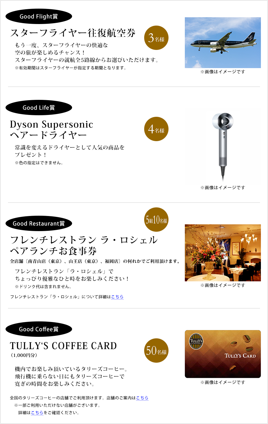 | キャンペーン内容 | 応募期間中、スターフライヤーの航空券をご予約・ご購入頂き、かつキャンペーンにご応募頂いたスターリンク会員の中から抽選で素敵な賞品をプレゼントいたします。 |
