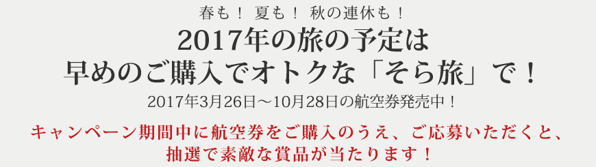 | 応募期間 | 2017年1月26日(木)〜4月16日(日) (対象搭乗期間:2017年10月28日まで) |