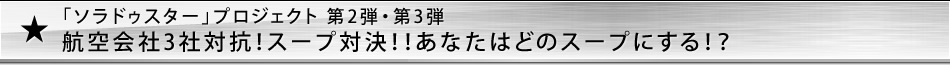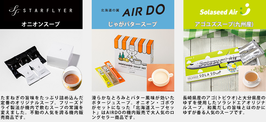 | キャンペーン概要 | 当キャンペーンと連動して2017年3月3日(金)に羽田空港にてスターフライヤー、AIRDO、ソラシドエアの対象便にご搭乗のお客様に、各社のスープをプレゼントするイベントを実施いたします。