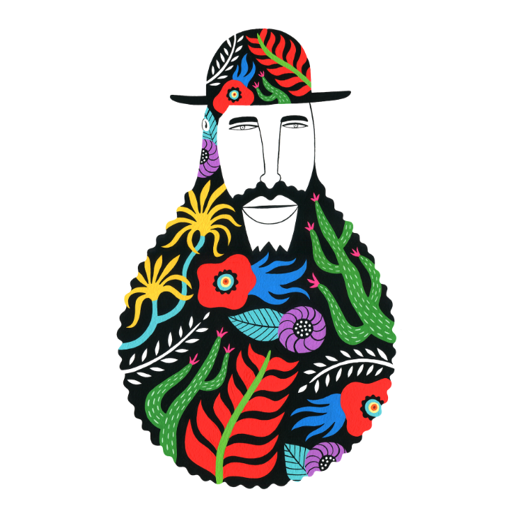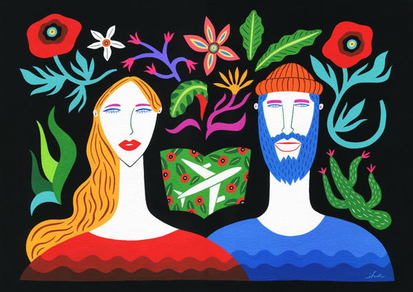 実際にそこにいるような想像をして話をしていると、カラフルなイメージが頭に浮かび期待がどんどん大きく膨らんでいきます。旅について語らい「話に花が咲く」そんな楽しくて幸せな時間を絵にしました。
