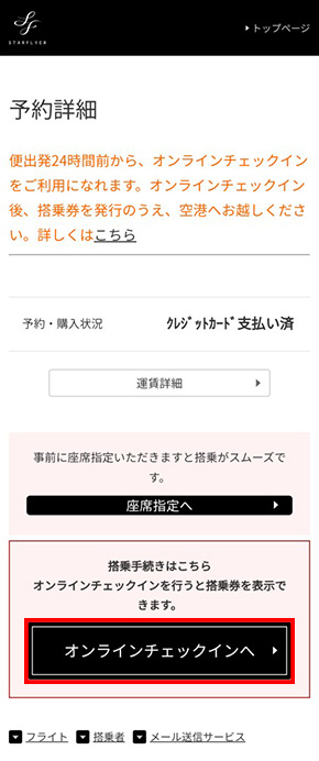 予約詳細画面「オンラインチェックインへ」ボタン(赤枠)※をタップしてください。