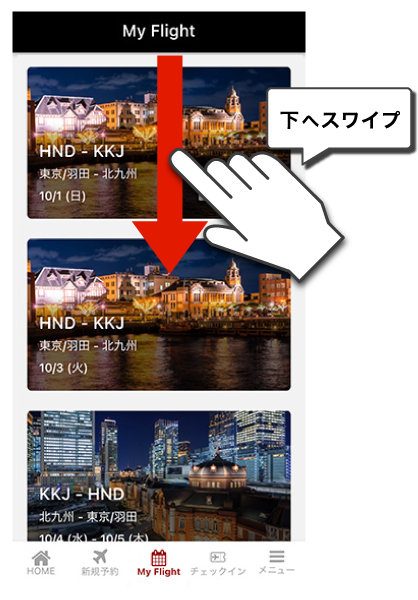 オンラインチェックイン後は、My Flight(予約一覧)画面を下にスワイプし、情報を更新してください。