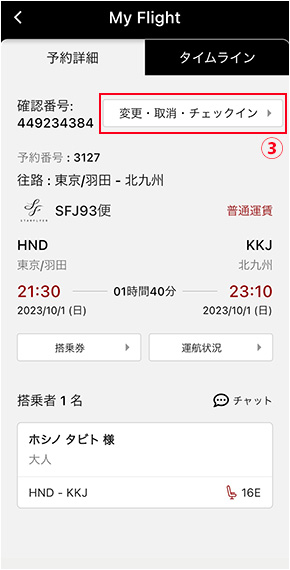 公式アプリの「My Flight」よりオンラインチェックインする予約の「変更・取消・チェックイン」ボタンをタップしてください。