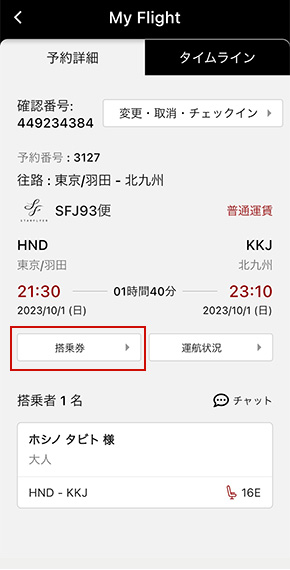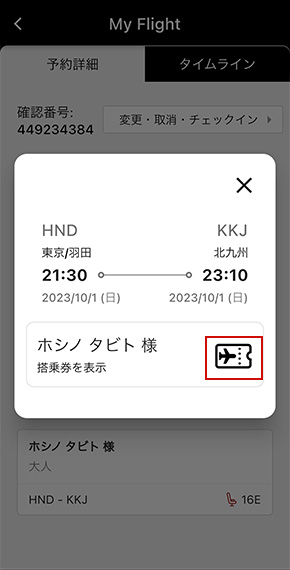 「My Flight」の「予約詳細」より「搭乗券」をタップ