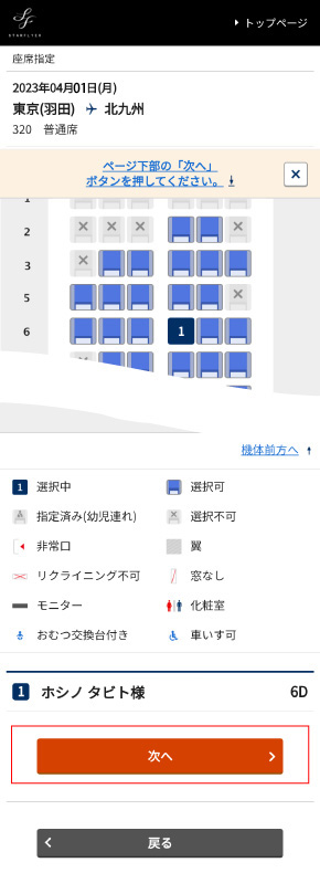 座席を選択して「次へ」をタップしてください。※事前座席指定されていればStep.5へ。