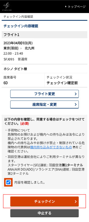 チェックイン内容を確認して「内容を確認しました」をチェックして「チェックイン」をタップしてください。