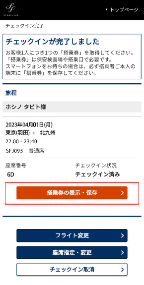 チェックインが完了しましたので「搭乗券の表示・保存」ボタンをタップして、搭乗券を発行してください。