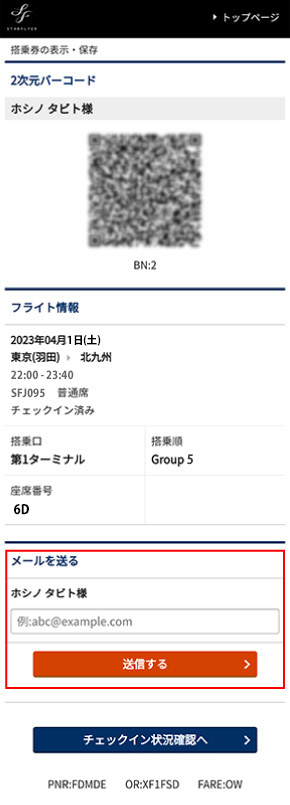 入力されたメールアドレスは搭乗券情報の送信目的にのみ使用されます(保存されません)。